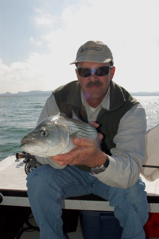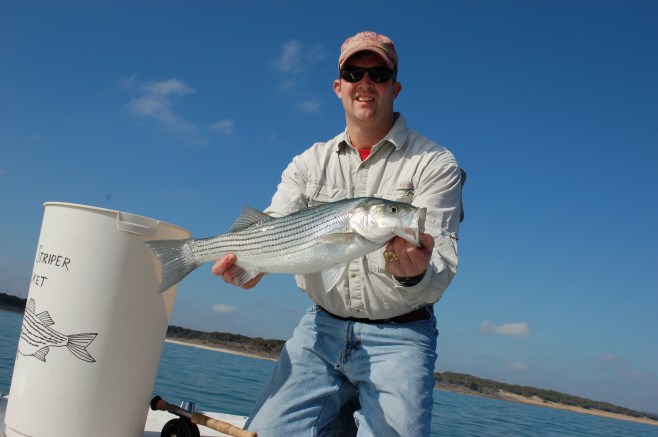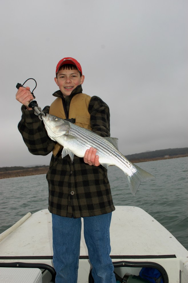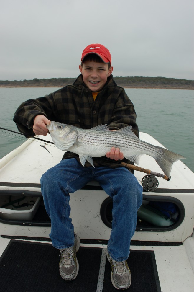 It was his first good striper on fly tackle and measured 22 inches and weighed 3.5 lbs on the Boga. We released it. We are planning to enter it as a Texas Junior Angler Fly Fishing water body record for Canyon Lake. He was excited… so was I! It was cold, windy, and damp out there this morning and he hung in there like a trooper. Great job Rhodes!