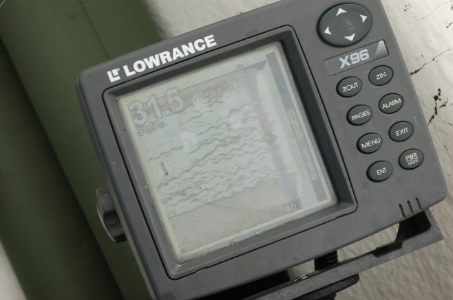 Got on the water this morning around 9:30 AM with my 13 yr-old son Rhodes. We headed over to Jacobs Creek area (#1 on map) and I rigged him up with a spinning rod and Sassy Shad. The stripers were right in the channel where they have been for the past month or so, and they were packed in thick. You can see the up-down effect of wave action on the fish in this photo of my graph. The boat (and transducer) rises and falls in the waves and it gives the fish a rippled look.
