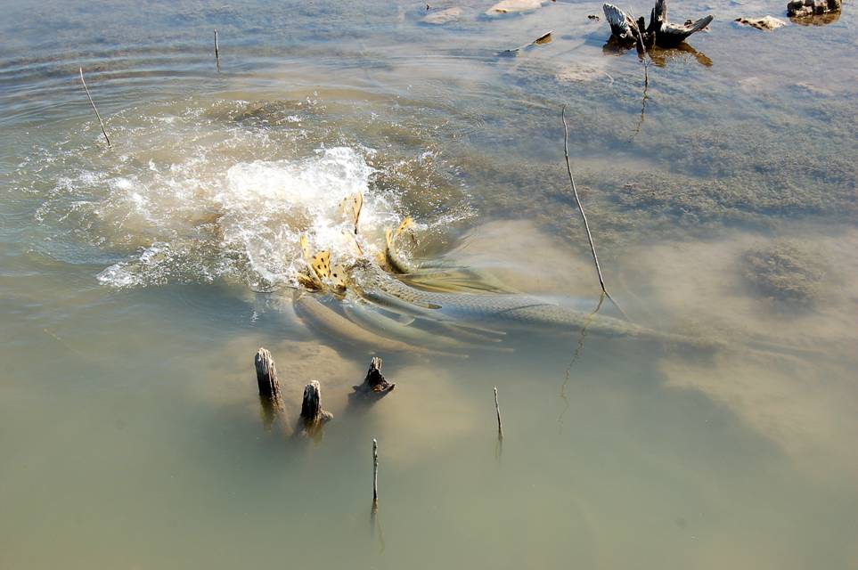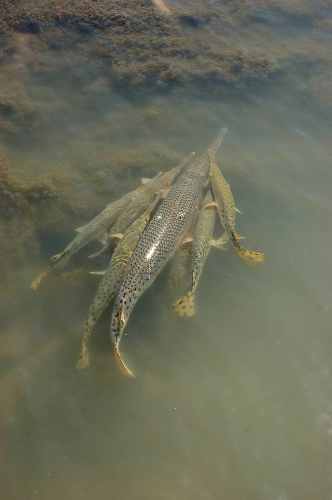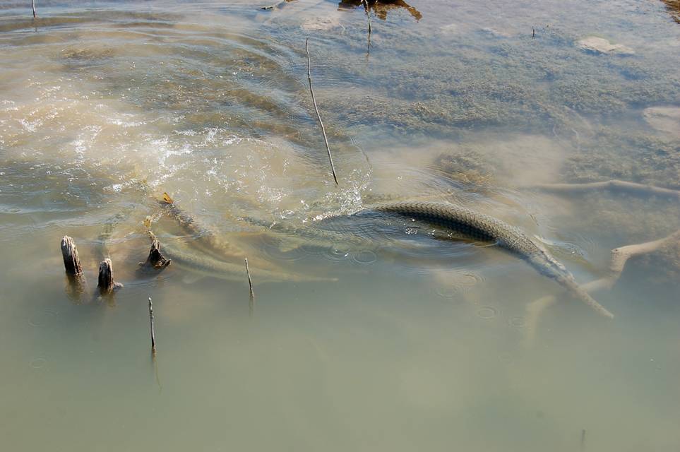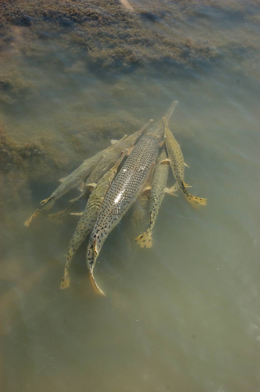 Here are a few shots of a large female longnose gar accompanied by many smaller males. They follow her wherever she goes. Nikon D50, 18-55mm, f/3.5