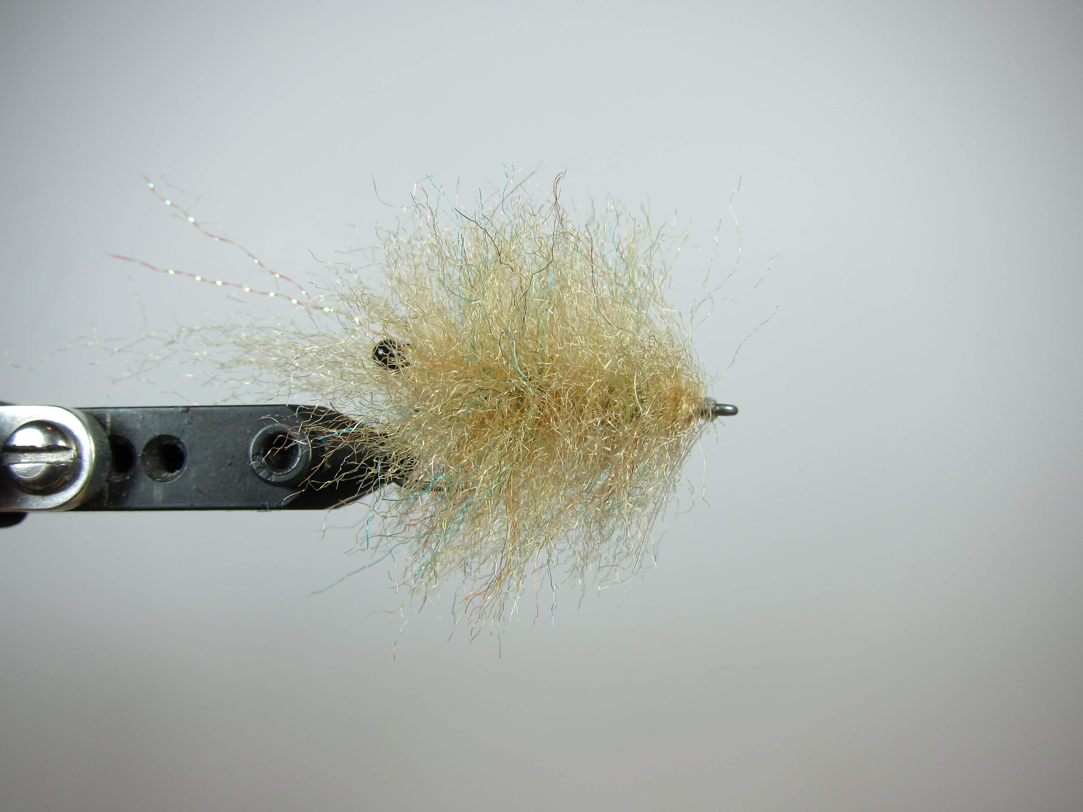 Smartt’s Shrimp is a small crustacean pattern that works well when redfish get picky, especially in the Spring when they are feeding on juvenile shrimp and crabs. Smartt’s Shrimp is light and easy to cast and somewhat translucent in the water. The eyes are made from burned/painted 60# mono and the body is formed with a dubbing loop using tan and brown EP fibers. The dubbing spinnner/hook (shown in photo) hangs from the dubbing loop and is used to spin and twist the EP fibers into a tight frizzy strand. Once palmered around the hook shank, the fibers are picked out thoroughly with Velcro and then trimmed to a tapered shape in the final step.