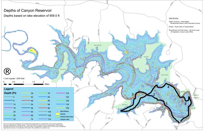 We launched at the boat ramp off Skyline (in the corner SW of the dam) and worked our way up to Comal Park, over to Jacob’s Creek Pt., and back down to the dam. For most of the day the water was glassy smooth and there was almost no boat traffic. There was light and sporatic topwater activity from largemouth bass but we did not see any stripers surfacing. We caught largemouth bass at locations 1, 2, 3, & 5 on the map. One 22-inch striper was caught in front of the sailboat marina (location 4 on map). It was good to be on the water but the fishing was slow.