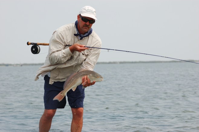 We waded another 50 yards and I glanced back over my left shoulder at some “used up” water. I suddenly saw a group of 3 reds grinding down the bank headed away from us. We had missed them. I made an awful-looking Hail Mary cast at them. I knew full well there was no way this cast was going to hit the mark, but figured, “Why not try.” Somehow the wind-blown fly landed right in their path. One of the fish rushed the fly, wolfed it down, and the fight was on. Yes! It appeared these fish must be feeding on small shrimp.