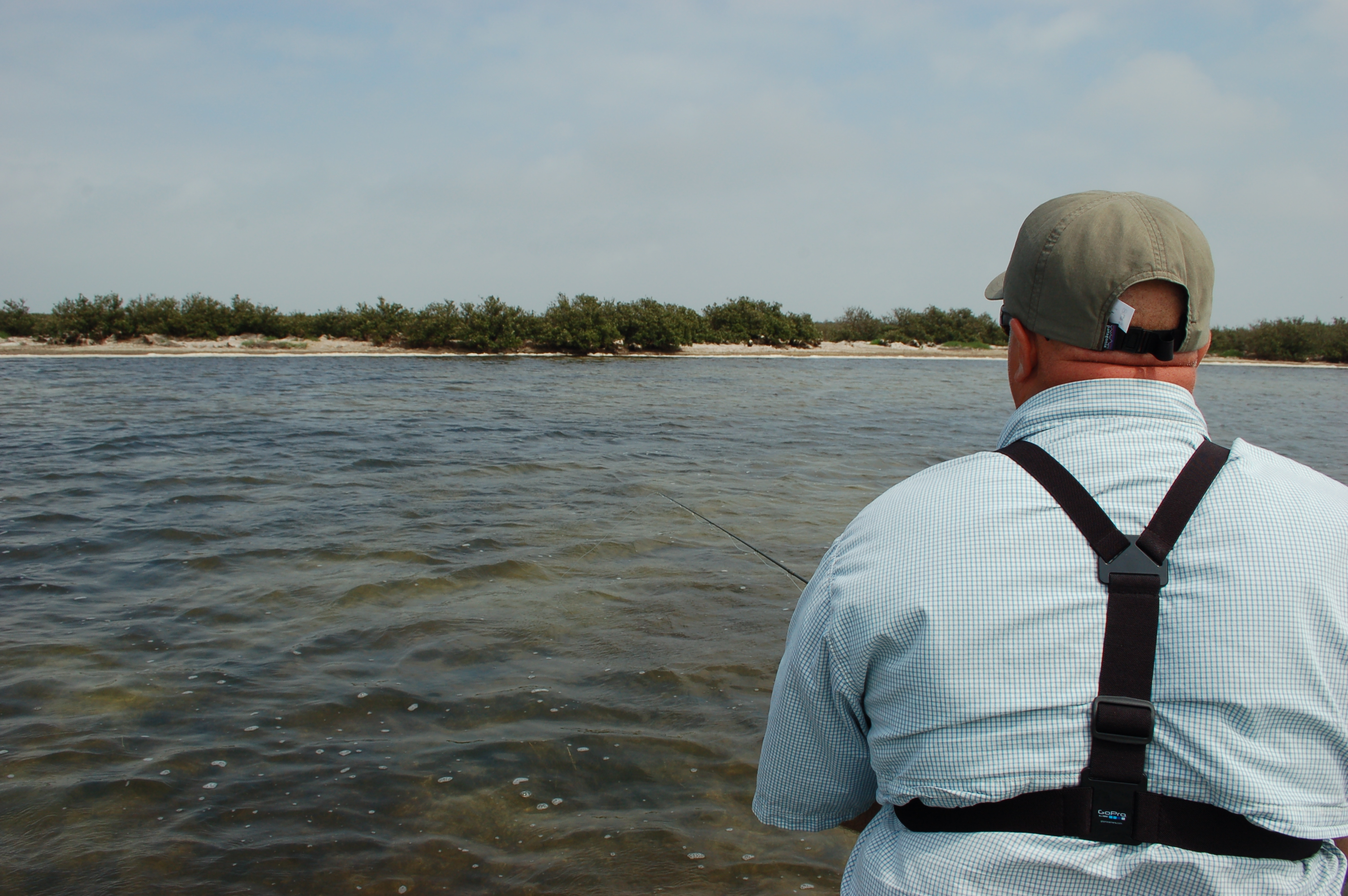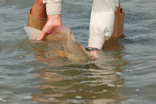 About 50 feet into the wade, we were greeted by a wonderful sight. Directly in front of us was a large redfish plowing carelessly through the choppy water. He was moving away from the bank swimming directly into the wind with this tail waving above the surface. I stripped off about 60 feet of