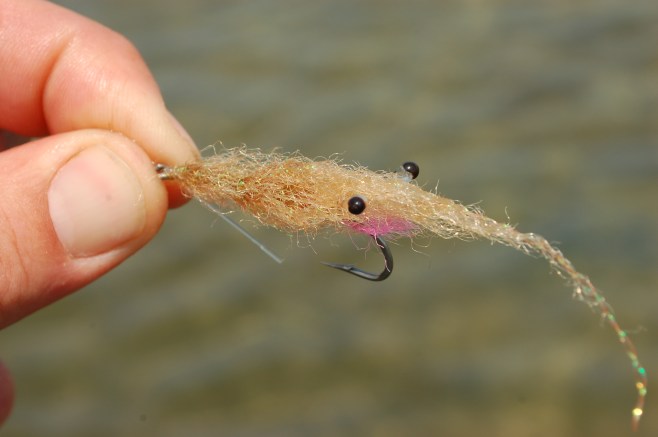 We continued ahead, wading quietly and scanning the choppy water for any signs of life. About 20 yards up, we spotted two more reds rolling on each other in the short choppy waves about 6 feet off the bank. John made several false casts and then plinked his fly near them. The reds saw the fly and sulked away, clearly irritated at the interruption. It was disheartening. Things seemed to be quickly shaping into one of those frustrating outings where you find feeding fish, but you can’t catch them. I took it as a cue to try a more subtle approach and tied on a small brown shrimp fly that had always been a great producer. It was worth a shot.