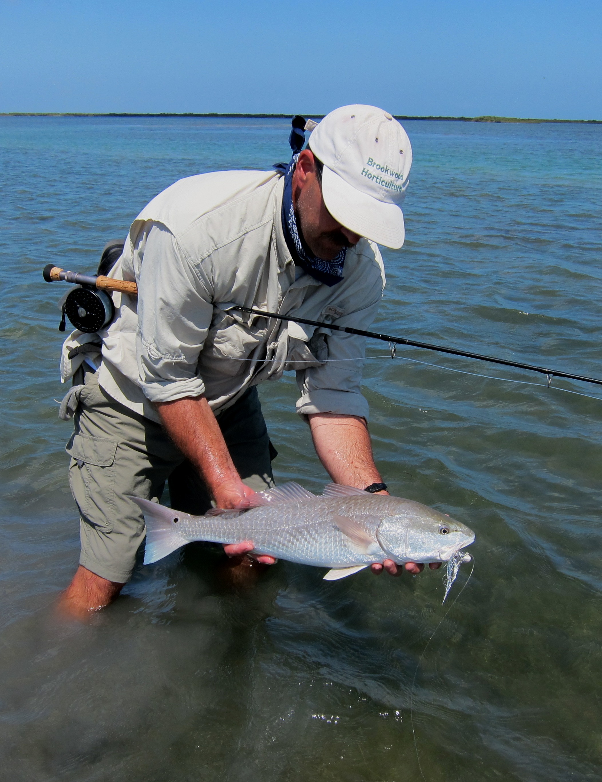 Up ahead I noticed a few surface wrinkles radiating from the bank… then a few more. It was a good sign. We paddled a bit closer and suddenly four redfish came into view. They were about 75 yards away and had their backs completely out of the water. We anchored our boats and quietly waded closer. I fired a small brown shrimp pattern up ahead of the first fish. The red turned and exploded on the fly. At first I thought I had spooked him but when line started ripping through my fingers I knew the fish was on. A few minutes later, Austin made an effortless long cast and landed his fly right on the mark of a second fish grinding through the sand. The fish surged forward and with a “chuck” sound, inhaled the fly. Austin’s reel zinged. It was a great sound.
