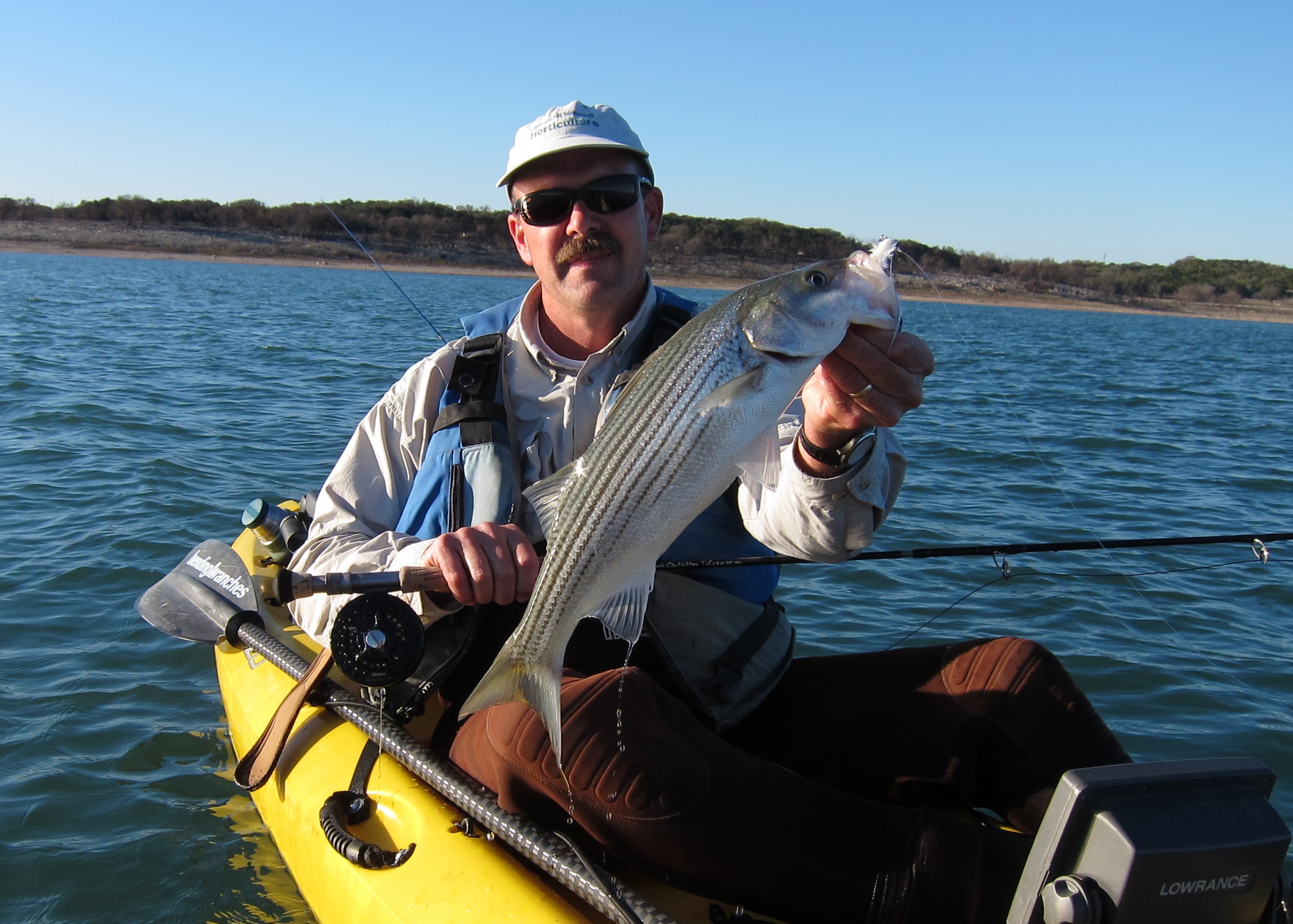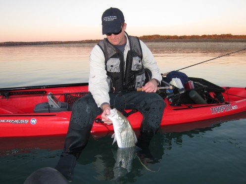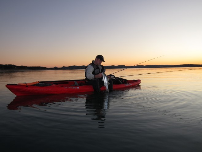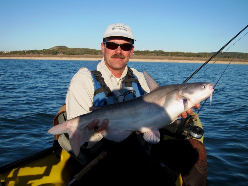 Fished Canyon this afternoon with my buddy Jon Fisher from San Antonio. It was a beautiful day on the water. Skies were clear and the winds were light. Jon and I launched our kayaks at the Jacob’s Creek boat ramp and fished the main channel of Jacobs Creek for most of the afternoon (spots 1 & 2 on map).