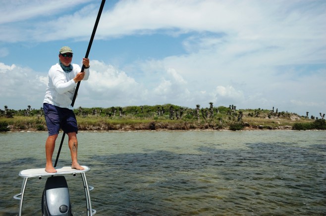 Captain John Spencer poling a shallow flat lined with Spanish daggers and prickly pear