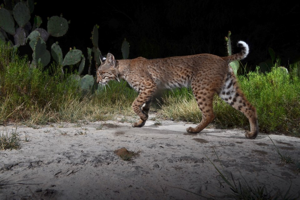 A bobcat gets a drink from a dwindling pool of water in a South Texas creek bed.